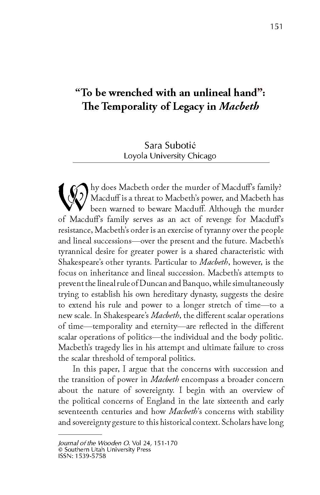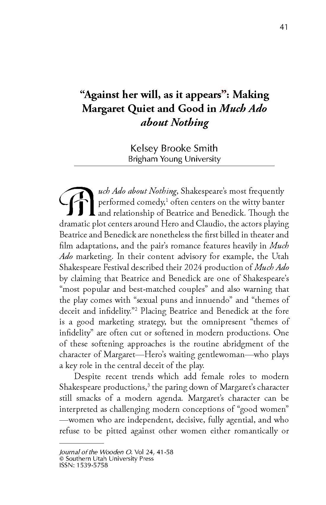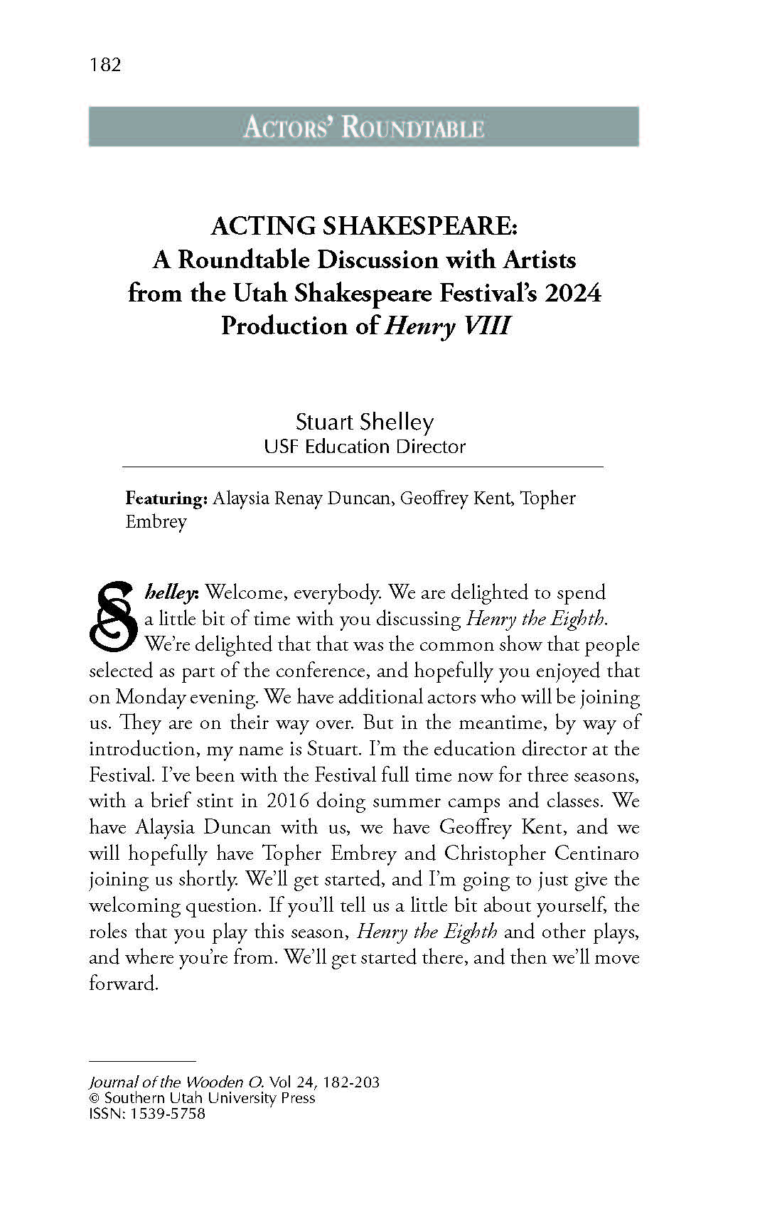SUBMISSIONS: Manuscripts should follow the Chicago Manual of Style, 17th edition. Manuscript submissions should generally be between 4000-8000 words in length. Please review the JWO Style Sheet, which may be found at https://www.suu.edu/library/wooden-o.html. The deadline for submission is October 17, 2025. Authors should include all of the following information on a separate page with their submission: